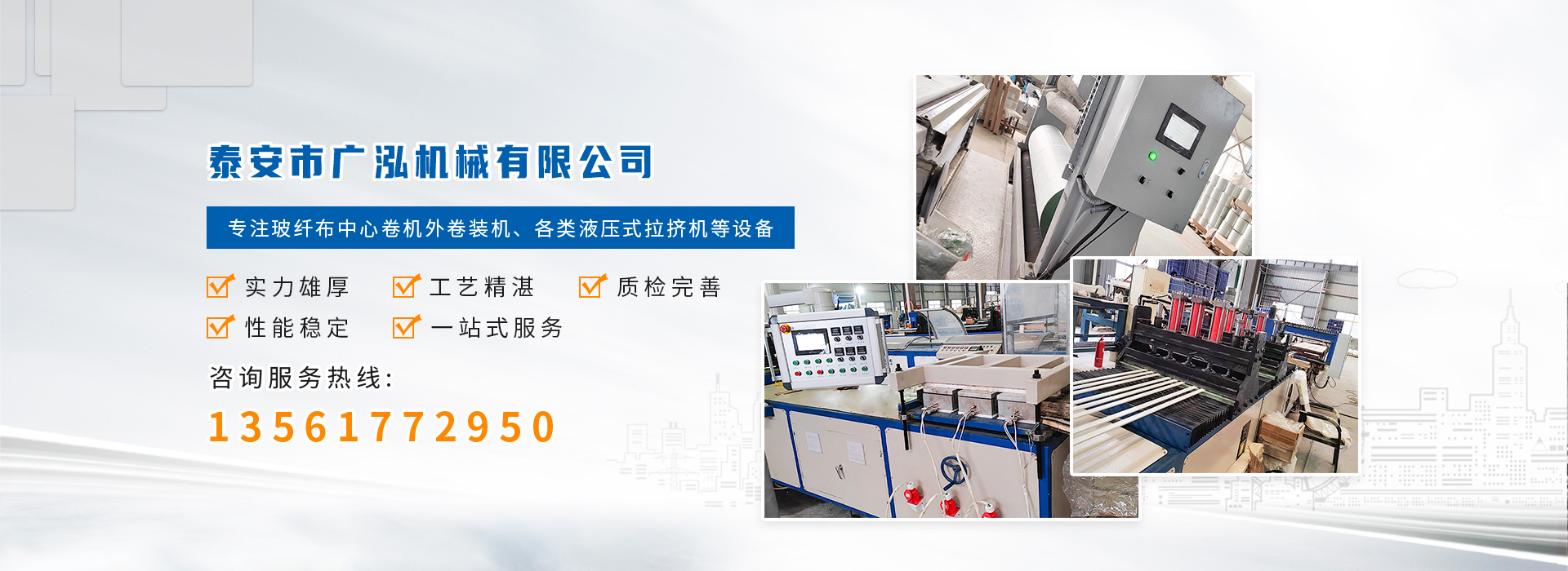 泰安市廣泓機械有限公司,是一家集研發、設計、生產、銷售、服務為一體的自動化機械設備制造企業。公司擁有一支由業內精英技術人士組成的研發隊伍,采用精湛生產工藝,致力為用戶提供自動化智能化的產品。經過多年來的發展及客戶的支持,公司現已研發了多種成熟設備推出市場,主要產品包含:玻纖布中心卷機外卷裝機、各類液壓式拉擠設備等產品,受到客戶的一致好評。公司不斷強化服務。堅持以質取勝、以誠取信的原則為廣大新老用戶提供更好、更滿意的產品。竭誠與新老客戶、各界朋友攜手合作,共創偉業!